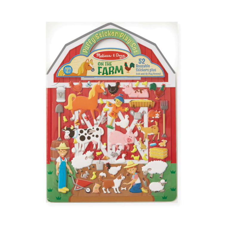 These reusable puffy stickers create down home farm fun! Pick your animal stickers and get the farmer going on his daily chores! Kids can build characters and tell stories with these fun stickers and scenes. Just layer the puffy stickers onto the double-sided background board of the barn or farm scenes, adding animals and tools. Ready for a story change? It’s easy to lift, switch, layer, and rearrange it all to depict whatever farm tale a child can imagine! A built-in sticker collection–52 reusable puffy stickers in all–offers endless opportunities for kids to express their creativity and have lots of pretend-play fun, all while improving fine motor skills and communication. It’s great for travel, too: The sturdy background board (with built-in handle!) folds to neatly store it all away.