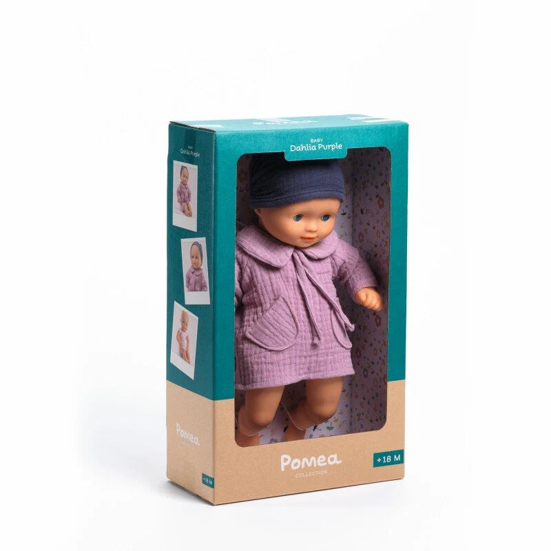 Meet Baby Dahlia Purple, the sweet little doll with big, dark blue eyes and an angelic face - perfect for children from 18 months! At 32 cm, it's just the right size for tiny hands to hug and hold. Its soft vinyl arms, legs, and face are so cuddly, while the flexible body can be posed like a real baby. Dressed in a cute cotton dress and scarf, this sleepyhead doll even closes her eyes when you lay her down for a nap!