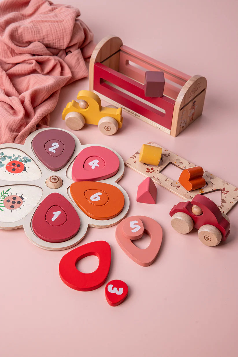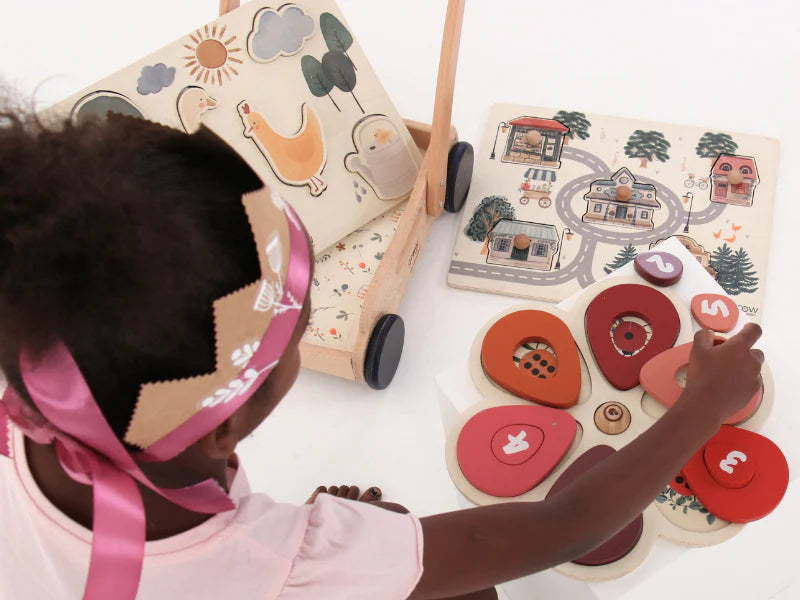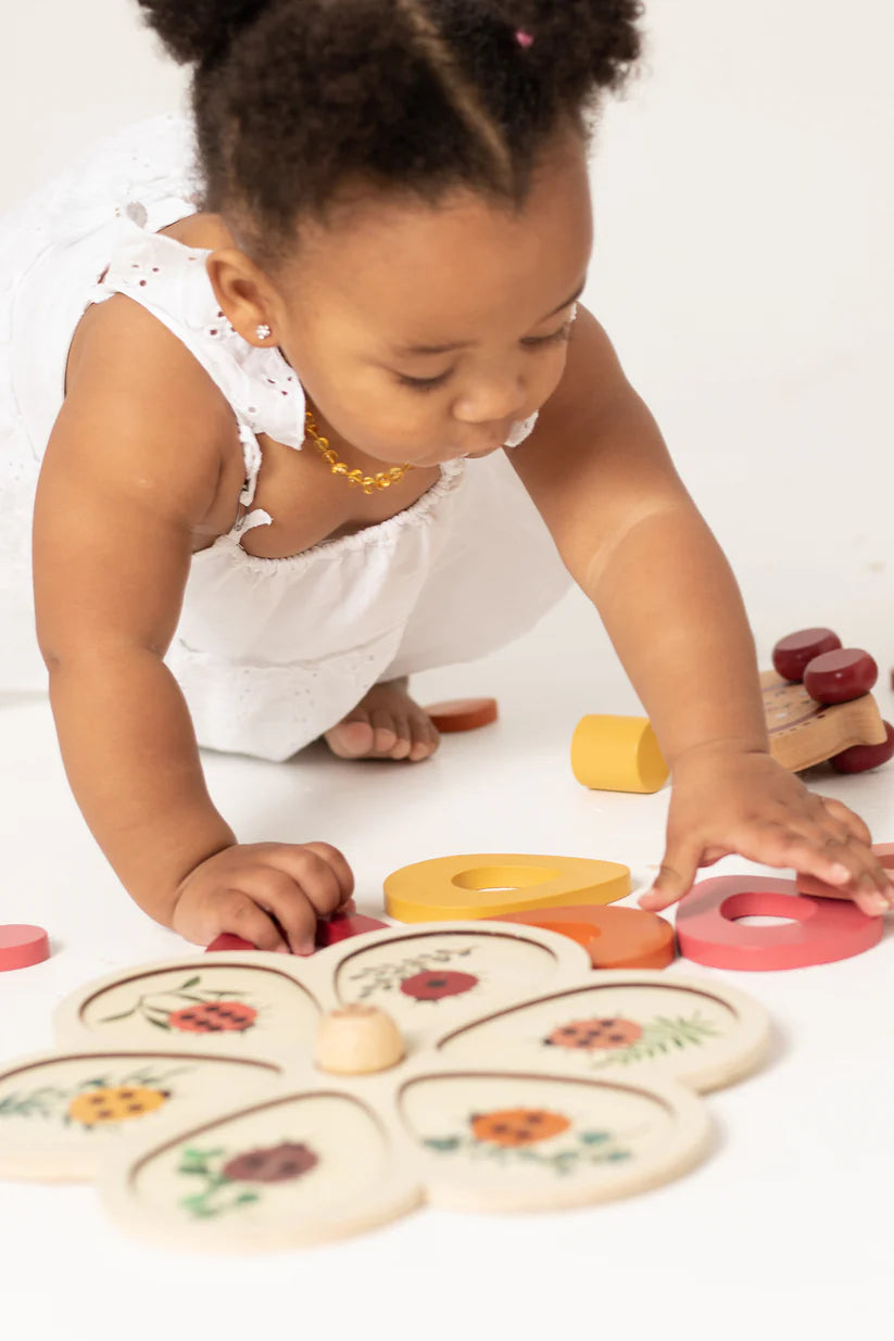 This colourful, flower inspired chunky puzzle will keep your toddler’s hands busy as they plan and problem-solve to fit the leaves. It is a puzzle and includes matching and counting elements, making it an all-in-one play solution.