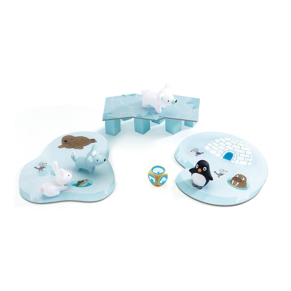 Game contains: 4 adorable plastic animals, 2 ice floe boards, 1 bridge, 1 dice and instructions to play