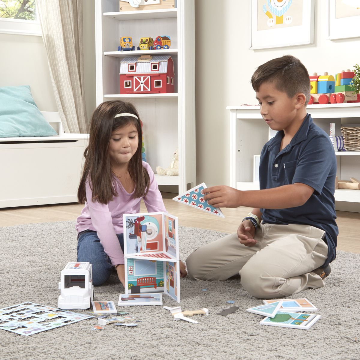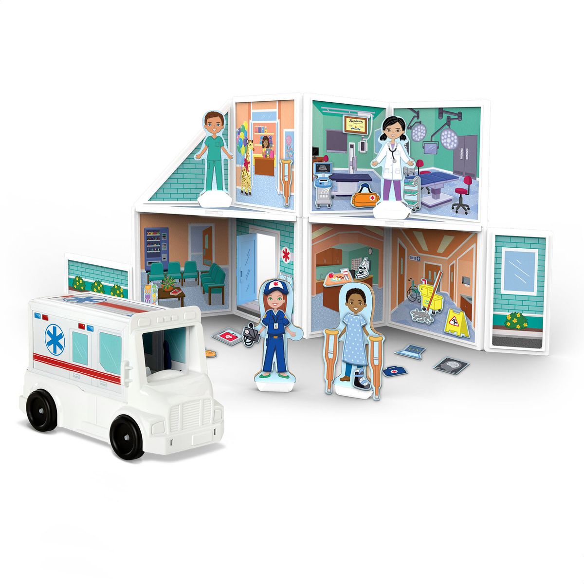 - Includes ambulance vehicle, 16 double-sided illustrated magnetic panels, 62 magnetic accessories, 2 magnetic wooden play figures with stands