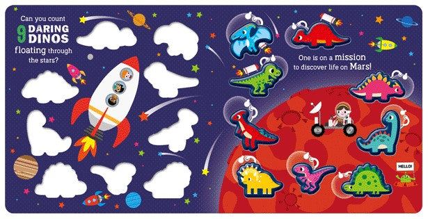 Dimensions: 210 x 210 x 15 mm Number of pages: 24 Description: Practice counting down from ten with the daring dinos! This busy board book has ten dinosaur-shaped blisters that disappear one by one with the turn of each page. From skateboarding to swimming, there’s plenty for little ones to explore! Format: Board Book / Silicone