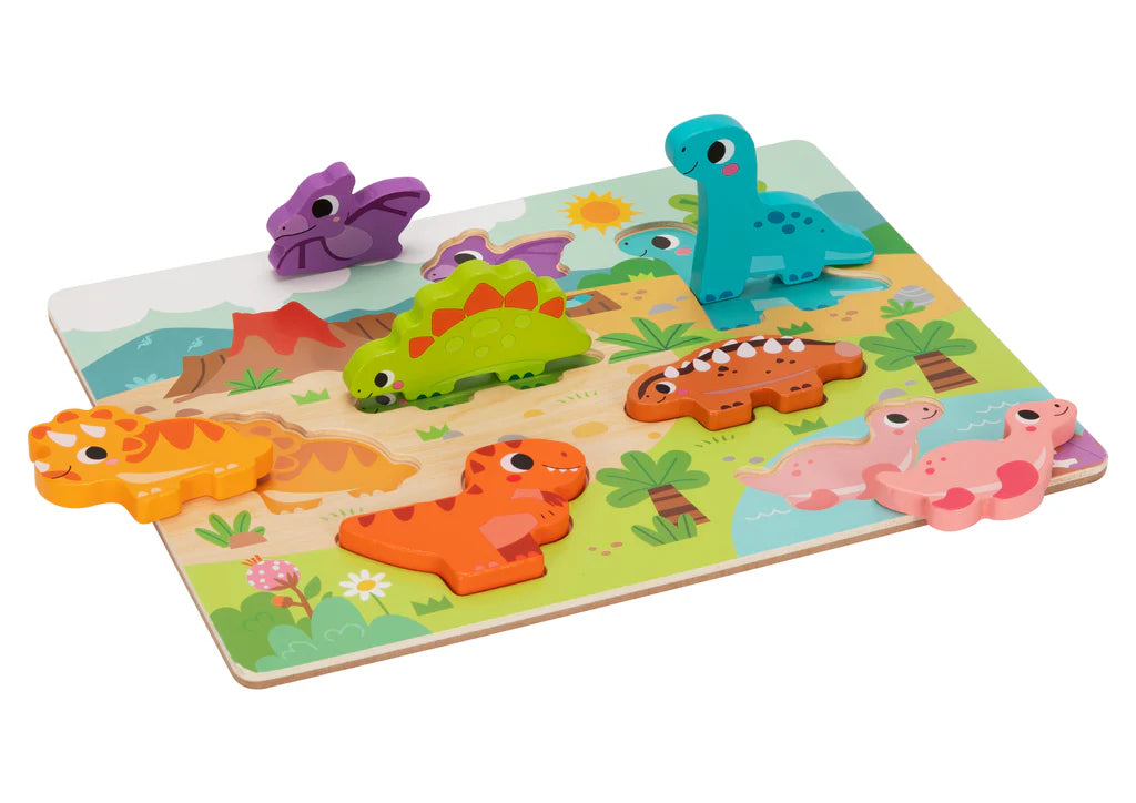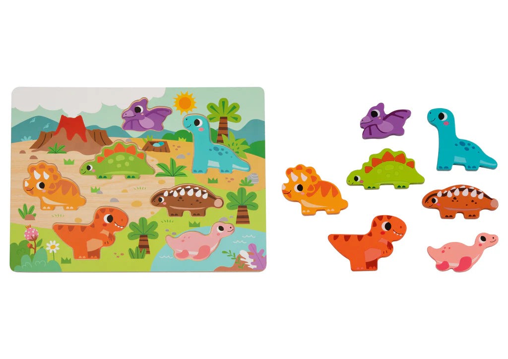 This vibrant 8-piece puzzle features 7 chunky dinosaur pieces that are perfectly sized for little hands to grasp, lift, and fit into place. It’s a playful way to support fine motor development, shape recognition, and imaginative learning—all while introducing kids to their favorite prehistoric creatures.