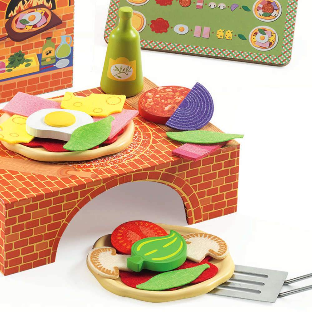 Djeco Pretend Food toy Pizza Oven play set - create your own pizza. The wooden box is designed to act as the pizza oven - cook pizzas according to the menu cards and your customers' orders! The Djeco Luigi Pizza has had a refresh and now includes more vegetable toppings.