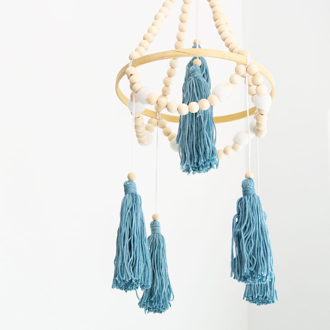The tassels are handmade from 100% hand-dyed bamboo yarn (such a gorgeous sheen!). A gentle breeze (window or fan) will ensure subtle movement of the mobile which encourages some stimulation for your littlie as he/she tracks the motion of the tassels.