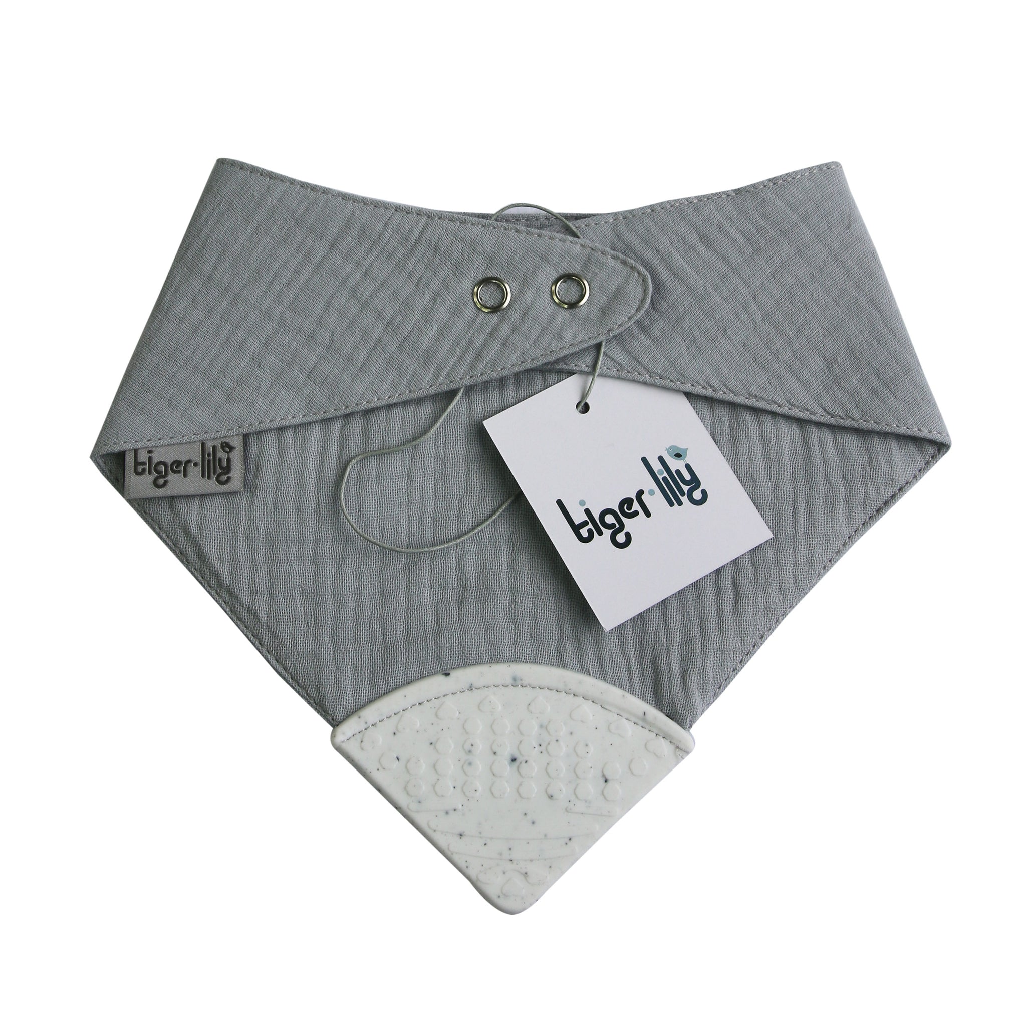 The Teether Bib boasts 4 layers of cotton muslin which sandwhich a thin waterproof layer. This helps prevent your little one's chest getting damp from teething 'drool'! The silicone teether is perfect to chew on and ease itchy, aching gums. There are 3 settings for the pop studs allowing you to adjust the neck opening for comfort. This fully reversible bib is the perfect accessory for the teething months & years.