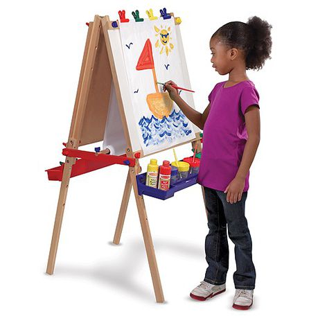 The Melissa & Doug Easel makes any room into an art studio! Our double-sided, adjustable-height, kid-sized art easel includes a dry-erase board, chalkboard, locking paper-roll holder (fits either an 18"" or 12"" wide paper roll), child-safe paper cutter, four easy-grip clips, and a plastic tray to attach to each side of the Deluxe Standing Easel. Assembly is easy, so there's little waiting for the next masterpiece! Children's easels are recommended for building fine motor skills and proper pencil grip--great for beginning writers! Use the chalkboard and whiteboard surfaces of our wooden easel as the ideal practise surface for a child's first letters and words. Paint, paint cups, and paint brushes sold separately.