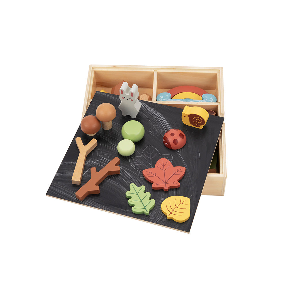 The versatile box is perfect for sorting, organizing, and stacking toys, with six compartments for added fun. The removable sliding lid doubles as a chalkboard, allowing your child to draw and recreate their very own forest floor.