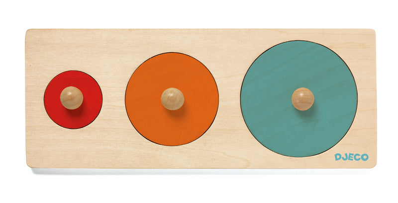 This appealing puzzle, inspired by Montessori pedagogy, helps children to develop their perception of dimensions and strengthen their hand-eye coordination.