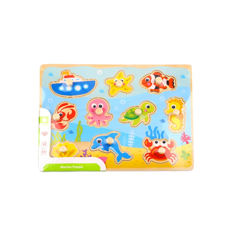 Children will love spending time with these cute ocean animals as they place each wooden puzzle piece over the matching picture on the puzzle board. This sturdy 9-piece puzzle features easy-grasp pegs and wooden construction. Promotes hand-eye coordination, fine motor skills, problem-solving skills, and much more.